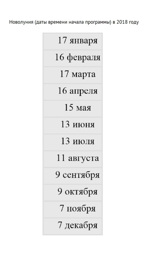 В интернете большое количество ресурсов, показывающих календари новолуния/полнолуния, приведу на 2018—2019 годы, но прошу обратить внимание, что если указано: новолуние 1 июня, то программу можно начать как 1 числа, так и 2-го! Почему?