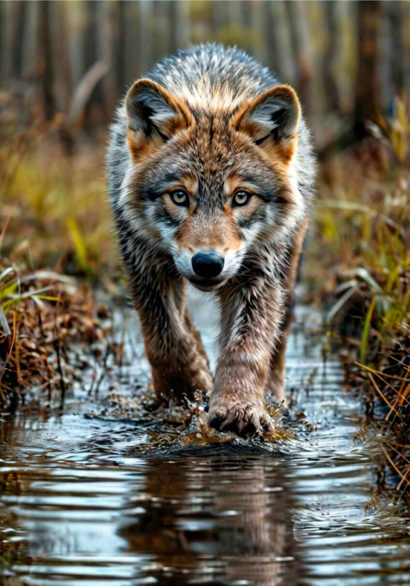 Вдоль болота будто потянуло, что-то густое и неведомое накрыло волчонка. Появился туман. Волчонок почувствовал себя беззащитным, в груди появилась тревога, по хребту пробежал холодок. Он посмотрел вперёд по тропинке, но взгляд упёрся в туман, как в серую непробиваемую стену, что встала на его пути. Сосны-ориентира больше не было видно. Волчонка сковал страх, но он уверенно сам для себя нарисовал картинку будто вступает на твёрдую поверхность своего родного леса, где всё знакомо, и он под защитой. «Нечего бояться» – решил волчонок, но страх не отступал.