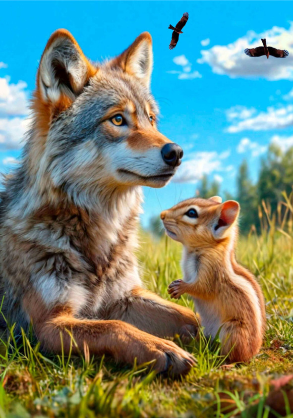 Бурундучок с волчонком вышли на полянку. В небе над ними парили гордые и могущественные птицы.