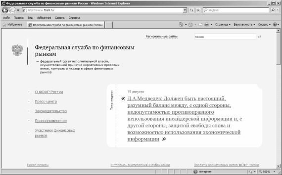 Сайт ФСФР (www.fcsm.ru) – один из наиважнейших источников полезных сведений: здесь можно ознакомится с текущей информацией о состоянии законодательной базы правового регулирования российского рынка ценных бумаг, последних постановлениях ФСФР, выдаче и отзыве лицензий у профессиональных участников российского рынка ценных бумаг, требованиям по аттестации специалистов на допуск к работе на рынке ценных бумаг. На сайте представлены также электронные версий Вестника ФСФР (еженедельного информационного бюллетеня, издаваемого ФСФР), приложений к Вестнику ФСФР, здесь же публикуются тексты постановлений ФСФР, Указов Президента РФ и Постановлений Правительства РФ, касающиеся регулирования российского фондового рынка (рис. 1).