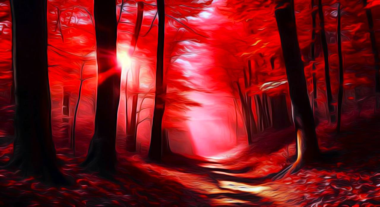 Дождь уже обильно шел. В лесу стоит огромный гул. Благо, что Зиннур успел добраться до леса, где на него капли не падали так обильно, как это было, если бы он находился в открытом поле. Этот лес, в котором бежит Зиннур, довольно необычный. Несмотря на тучи, которые были кучными некоторое время назад, утренние солнечные лучи все же протискивались и падали на землю, что немного освещало изумительные листья деревьев бордового цвета. Стволы деревьев стояли величественно и далеко друг от друга. В воздухе стоял стойкий запах влажной коры деревьев.