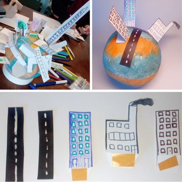 – Планета, на которой наклеены бумажные заводы, фабрики, трубы, из которых идет дым, пеньки от деревьев, дороги и стоянки, транспорт.