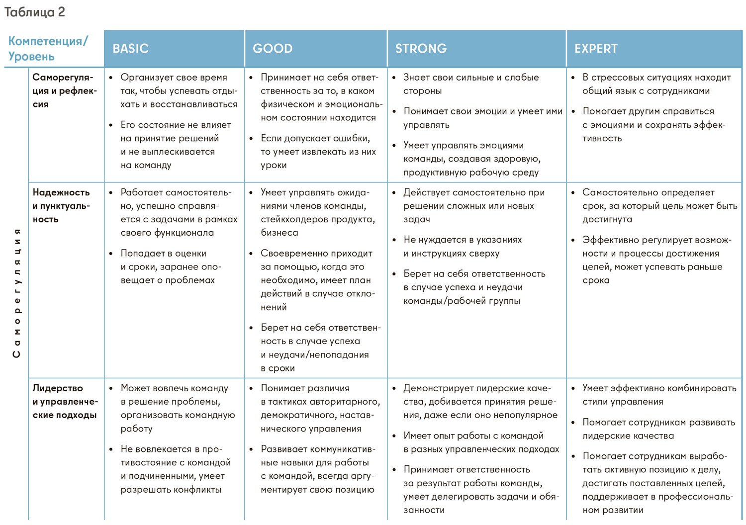 Дальше идут навыки саморегуляции: согласитесь, не слишком приятно иметь дело с человеком, который действует непредсказуемо и любит поскандалить. А если это ваш руководитель, то от его поведения зависит производительность целой группы людей (см. Таблицу 2).