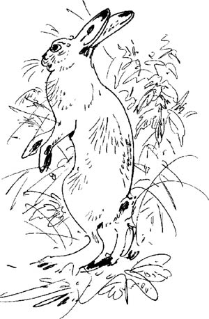 Заяц выпрямился и, к немалому удивлению Бемби, уселся на задние ноги. Поставив уши торчмя, он внимательно прислушался, затем опробовал воздух своим подвижным носом и снова чинно опустился на все четыре ноги.