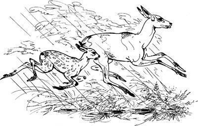 Другой раз гроза застала их в пути. Бемби бежал позади матери. Каждый удар грома словно сдувал его с дороги в кусты, каждый высверк молнии возвращал назад. Бемби потерял над собой всякую власть. Лес казался вымершим, его обитатели попрятались кто куда. Да и как было не прятаться, когда с каждого сучка, с каждой ветки бежал свой водопадик, когда деревья, кусты и травы были пропитаны водой и каждая вспышка молнии отражалась в тысячах капель и струй, будто лес на миг воспламенялся!