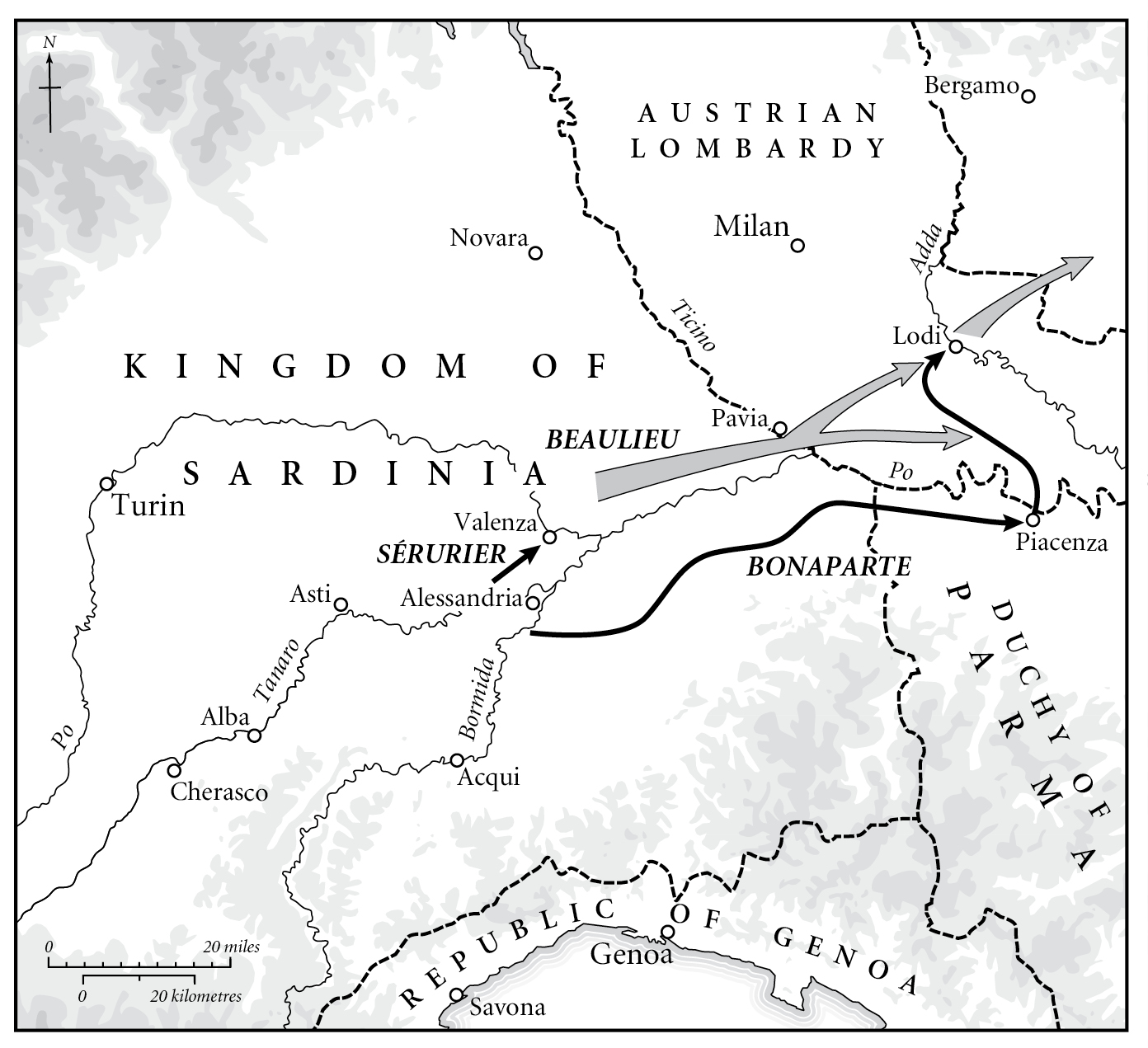He ordered Sérurier to feign crossing the Po at Valenza in order to prompt Beaulieu to defend that stretch of the river. He himself led a small body of troops in a forced march covering sixty-four kilometres in thirty-six hours along the right bank of the river to Piacenza. There, deep in the Austrian rear, he crossed the river on 9 May 1796, hoping to cut off Beaulieu’s line of retreat. ‘The second campaign has begun,’ he wrote to Carnot that evening. ‘Beaulieu is disconcerted; he calculates poorly and constantly falls into the traps set for him.’ But the Austrian commander had realised what was happening and hastily fell back across the next line of defence, the river Adda. Bonaparte pursued him but failed to catch up, reaching the little town of Lodi as the Austrian rearguard was crossing the river. He only just managed to bring up a couple of guns and open fire to prevent them from destroying the bridge.2