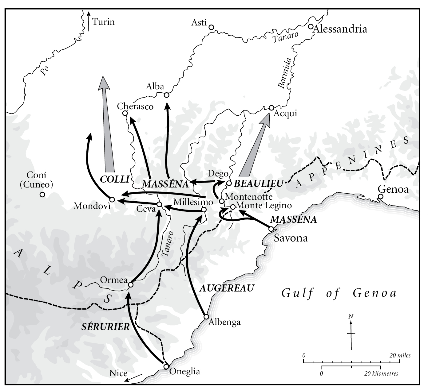 Beaulieu had in fact spent the day several kilometres away, sitting badly bruised by a roadside while his escort struggled to repair the carriage that had pitched him to the ground. He had realised his mistake too late and had lost valuable time, which Bonaparte was not going to let him regain. He urged Augereau, most of whose men were still marching without boots, and many without muskets, to hasten his attack on Millesimo, and Masséna to strike further into the Austrian rear at Dego. Once Augereau had accomplished his task, he was to swing left and begin to roll up the extremity of the Sardinian line.