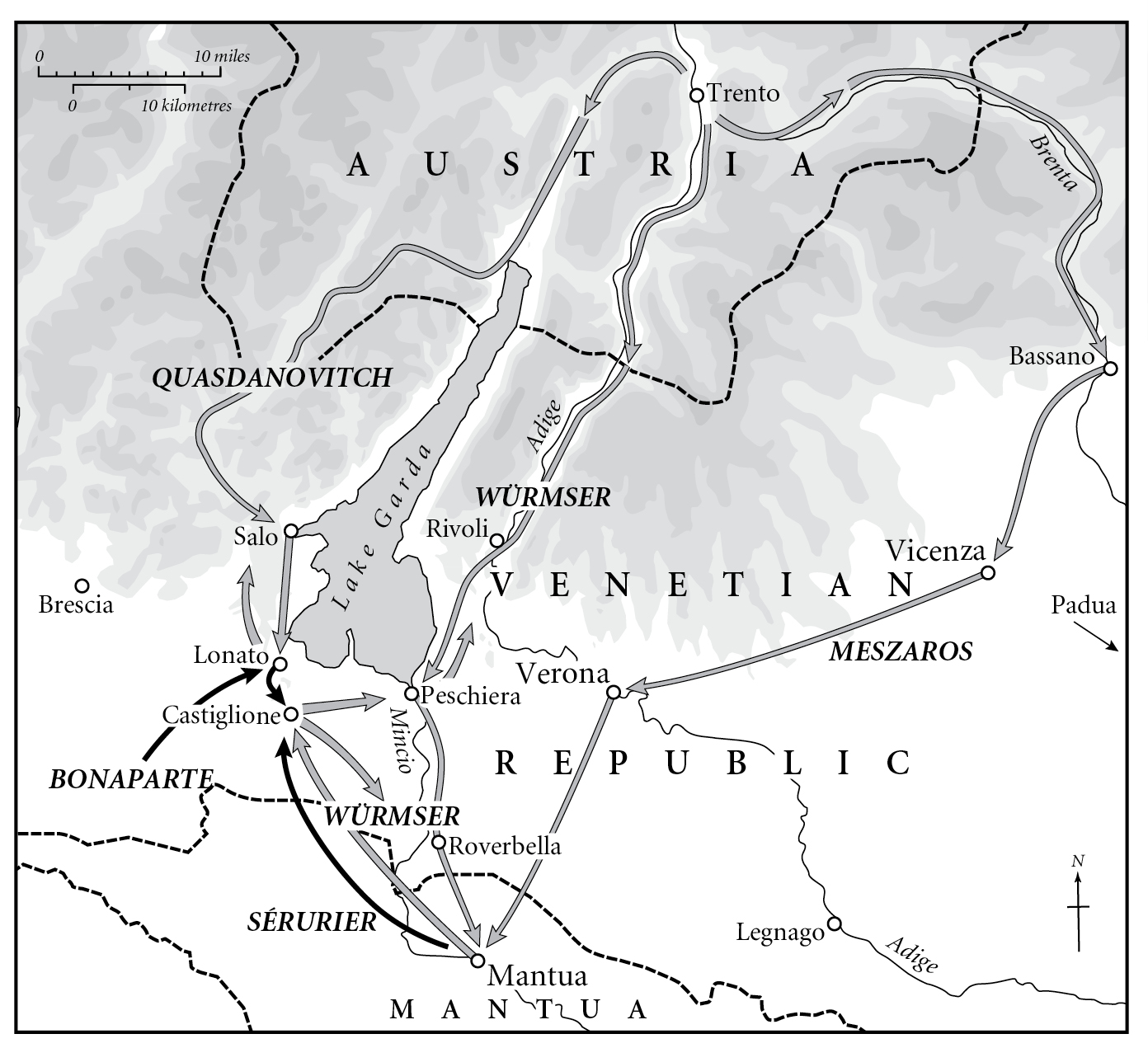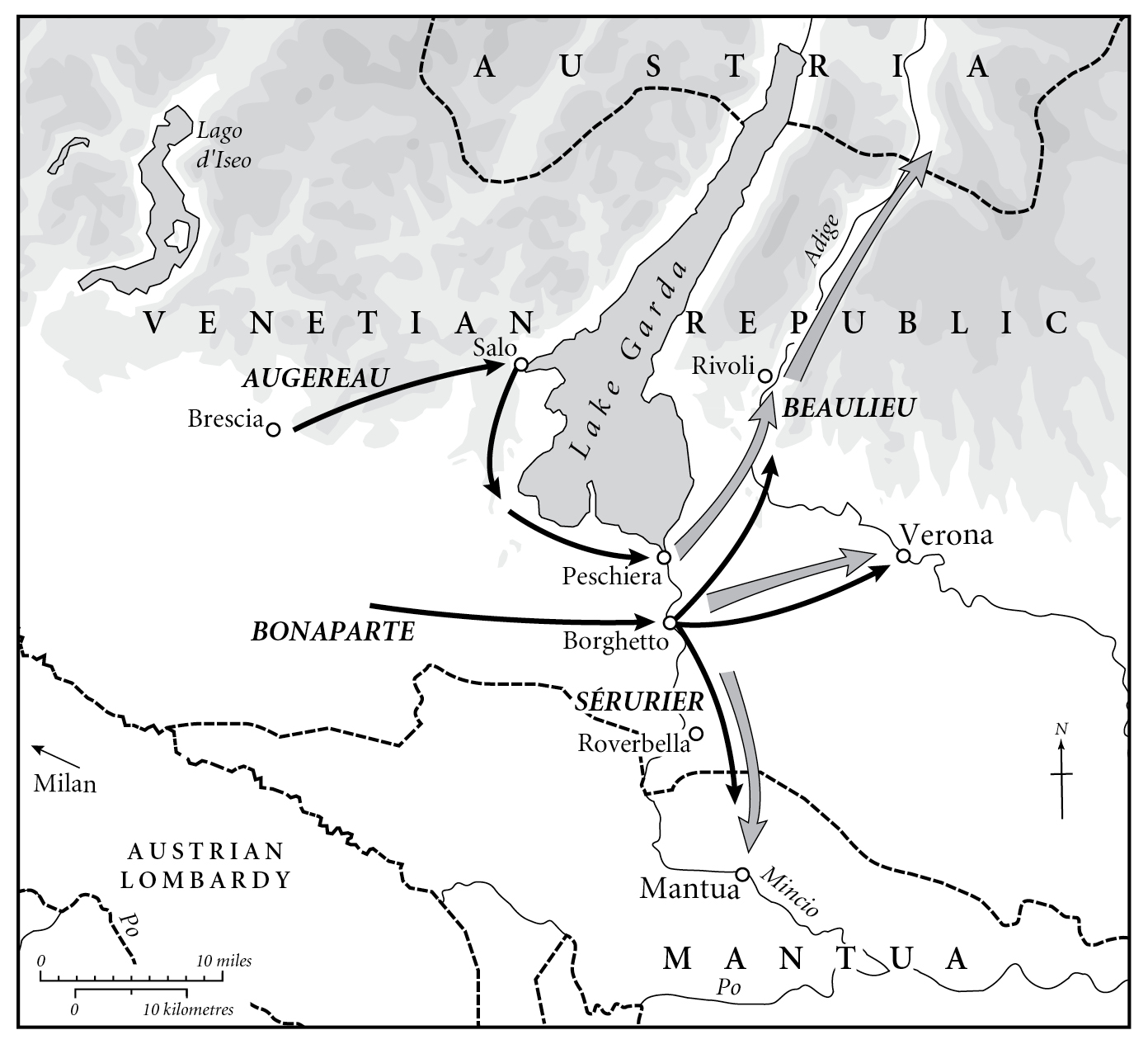 Bonaparte had never accepted the secondary role of staging a diversion in Italy while Moreau carried out the main operations in Germany, and was determined to reverse this by striking first. Assuming that Moreau must have crossed the Rhine, he was eager to press on. Beaulieu had fallen back behind the river Mincio, his right wing resting at Peschiera on the southern shore of Lake Garda and his left on Mantua. Moving briskly, Bonaparte pierced his line at Borghetto and then turned north to roll it up. Disorientated Austrian units raced north in order to avoid being cut off, but some were overtaken by the French advance. At Valeggio, where he had just sat down to a light lunch with Masséna and Murat, Bonaparte was surprised by an isolated enemy unit and only had time to pull on one boot before making a dash for safety over a wall. By dawn the following day he was pursuing the Austrians falling back on Peschiera and Verona, which he reached on 3 June. He was overwhelmed by the beauty of the city. ‘I have just seen the amphitheatre,’ he reported to the Directory. ‘These remains left by the people of Rome are truly worthy of it. I could not help feeling a sense of humiliation when I thought of the tawdriness of our Champ de Mars.’22