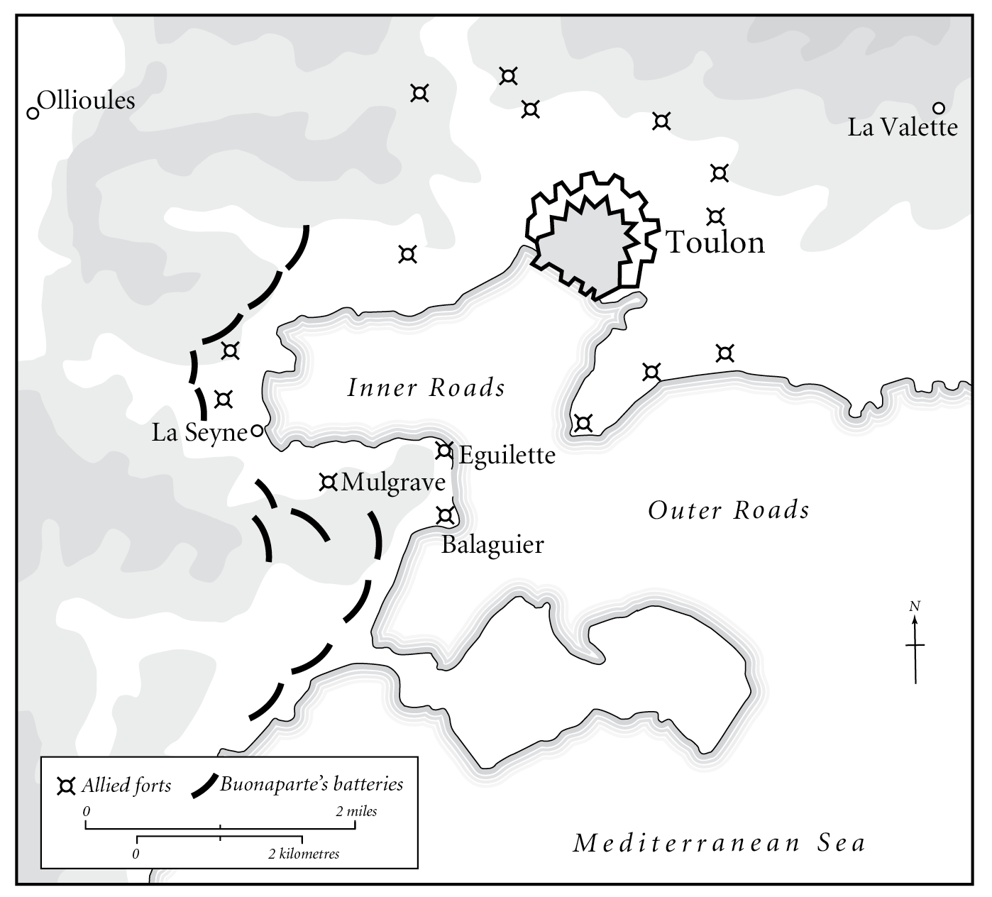 If Toulon was impregnable on the landward side, it could not hold out unless it was resupplied by sea, and no ship could approach the harbour if the heights commanding the roads were not secured. Buonaparte was not the first to see that capturing these was the key to taking the city – it was obvious from a glance at the map, as even the governing Committee of Public Safety in Paris had pointed out. But while most of those at headquarters saw the area of La Seyne on the inner roads as the place from which to threaten the allied fleet, Buonaparte believed that it was the two forts of Balaguier and Éguillette on the promontory of Le Caire, commanding access to the outer roads, that were crucial. They were held by allied troops, and it would take artillery to dislodge them. But all Buonaparte found on arrival were two twenty-four-pounders, two sixteen-pounders and two mortars. It was not much to be going on with, but enough to enable him to chase an allied force and a frigate away from the La Seyne area and set up a battery there which he named, to stress his loyalty, La Montagne.9