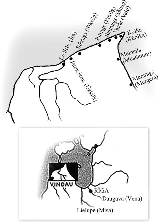 Карта Ливонии XIII века. Рига и поселения «морских» ливов. На карте обозначены современные наименования географических названий Латвии, а в скобках – используемые в книге географические названия поселений Ливонии на языке ливов в XIII–XIV веках.
