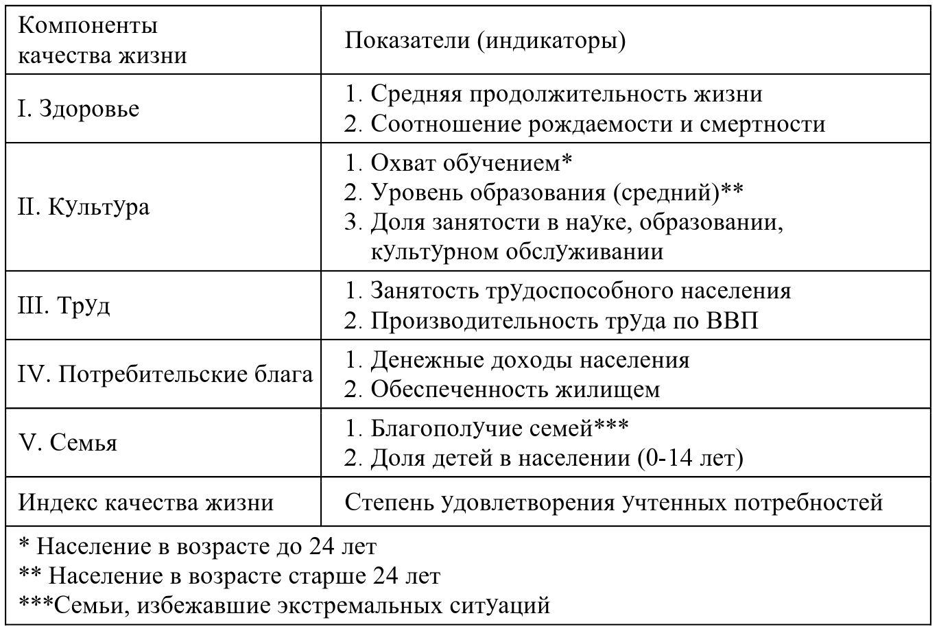 • в-пятых, объединяет объективные и субъективные показатели жизнедеятельности людей.