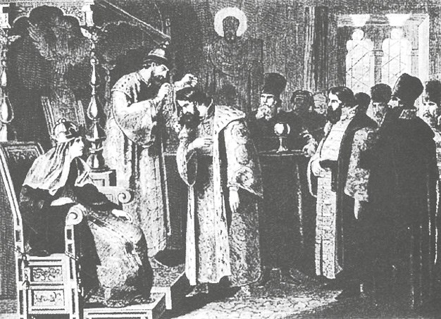 Филарет опустился на колени и земно поклонился трижды; потом, подойдя к кресту, он снова опустился и земно поклонился, после чего приложился к кресту, в то же время благословляя склонившего голову священника. То же он сделал пред иконами, а следом за ним то же делал и царь Михаил, и все бояре.