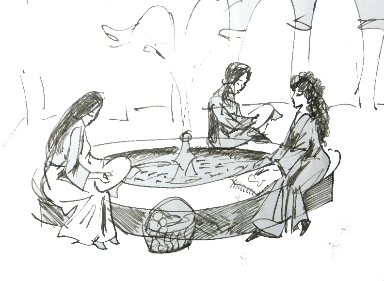 Девушки устроились возле фонтанчика, вороша объемистую корзину. Они доставали то тесьму, то ленты, то мотки ниток и куски тканей. К текстильной вакханалии присоединилась Синтия. Восторженные возгласы звенели под арками. Сколько же шума могут произвести три девушки!