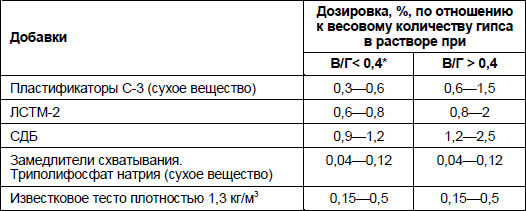 Для соблюдения вышеперечисленных технологических требований в состав гипсовых растворов вводятся добавки пластификатора и замедлителя схватывания (табл. 2.1).
