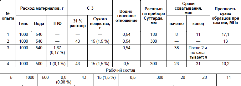 Таблица 2.4. Физико-механические свойства водных растворов гипса марки Г-7 с добавками С-3 и ТПФ