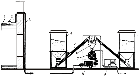 Рис. 2.2. Технологическая схема устройства самонивелирующихся стяжек с использованием машин циклического действия: 1 – готовая стяжка; 2 – гаситель; 3 – растворопровод; 4 – бункер с сухой смесью; 5 – загрузочное устройство; 6 – весовой дозатор; 7 – растворосмеситель; 8 – растворонасос; 9 – расходомер воды