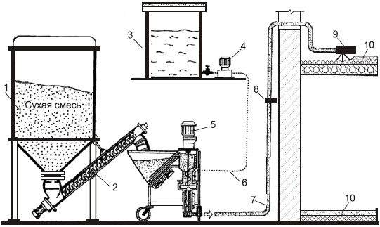 Рис. 2.3. Технологическая схема устройства самонивелирующихся гипсовых стяжек с использованием машины непрерывного действия: 1 – бункер с сухой смесью; 2 —загрузчик; 3 – емкость для добавки; 4 – водяной насос К 20/18; 5 – машина Э-316А; 6 – водяной напорный шланг; 7 – растворовод 2-секционный; 8 – быстроразъемное соединение; 9 – концевой гаситель; 10 – гипсовая стяжка