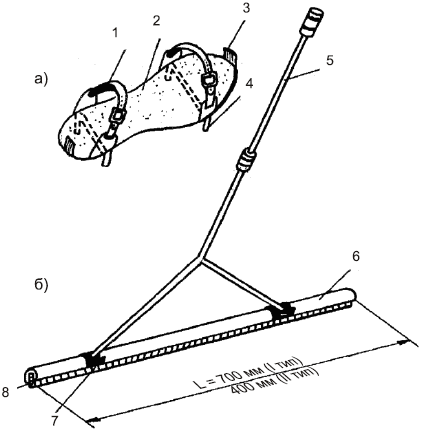 Рис. 2.4. Приспособления, используемые рабочими, занятыми на изготовлении самонивелирующихся стяжек: а – подножка; б – гладилка; 1 – ремень; 2 – пластина-опора; 3 – ограничитель; 4 – скоба; 5 – рукоять; 6 – трубка ПВХ с прорезью; 7 – фиксатор; 8 – полоса пористой резины