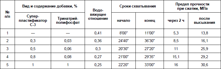 Принцип действия таких модификаторов основан на создании условий для образования водоустойчивых соединений, формировании более плотной структуры и высокой дисперсности новообразований твердеющей системы при низком содержании воды.