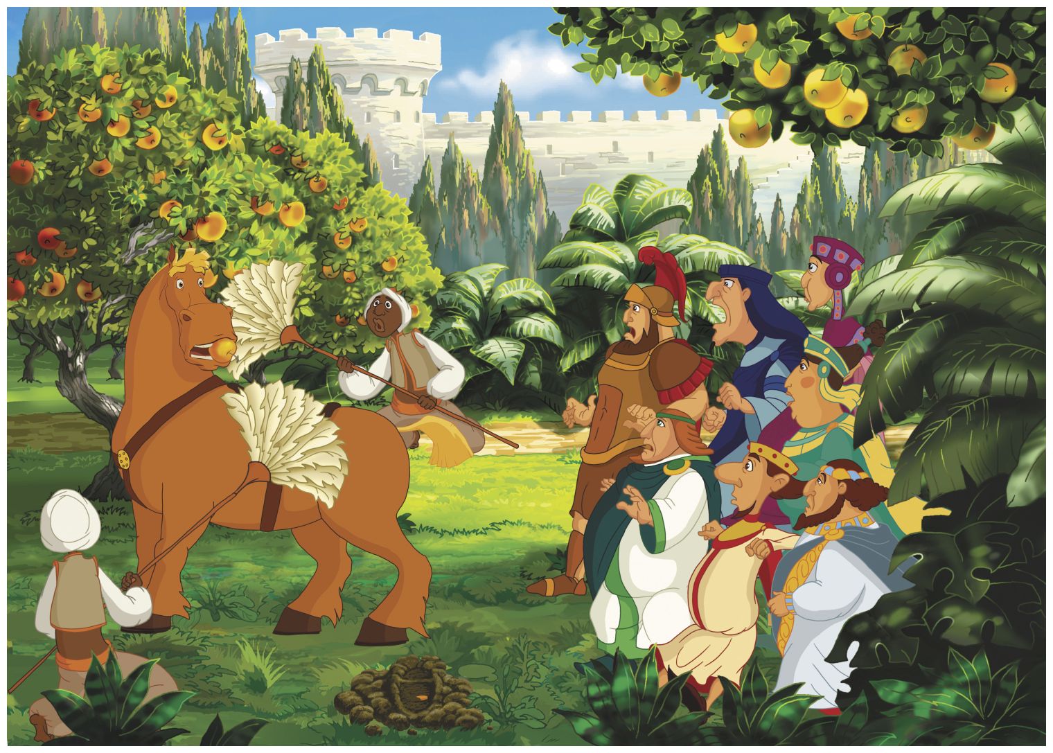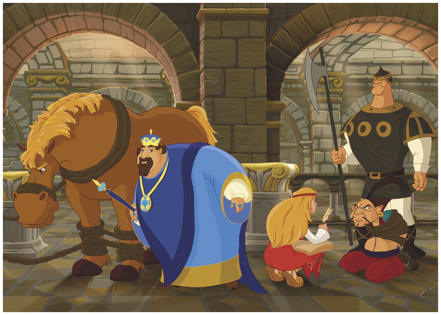 Император и его подданные собрались в конюшне, где был привязан конь волшебный.
