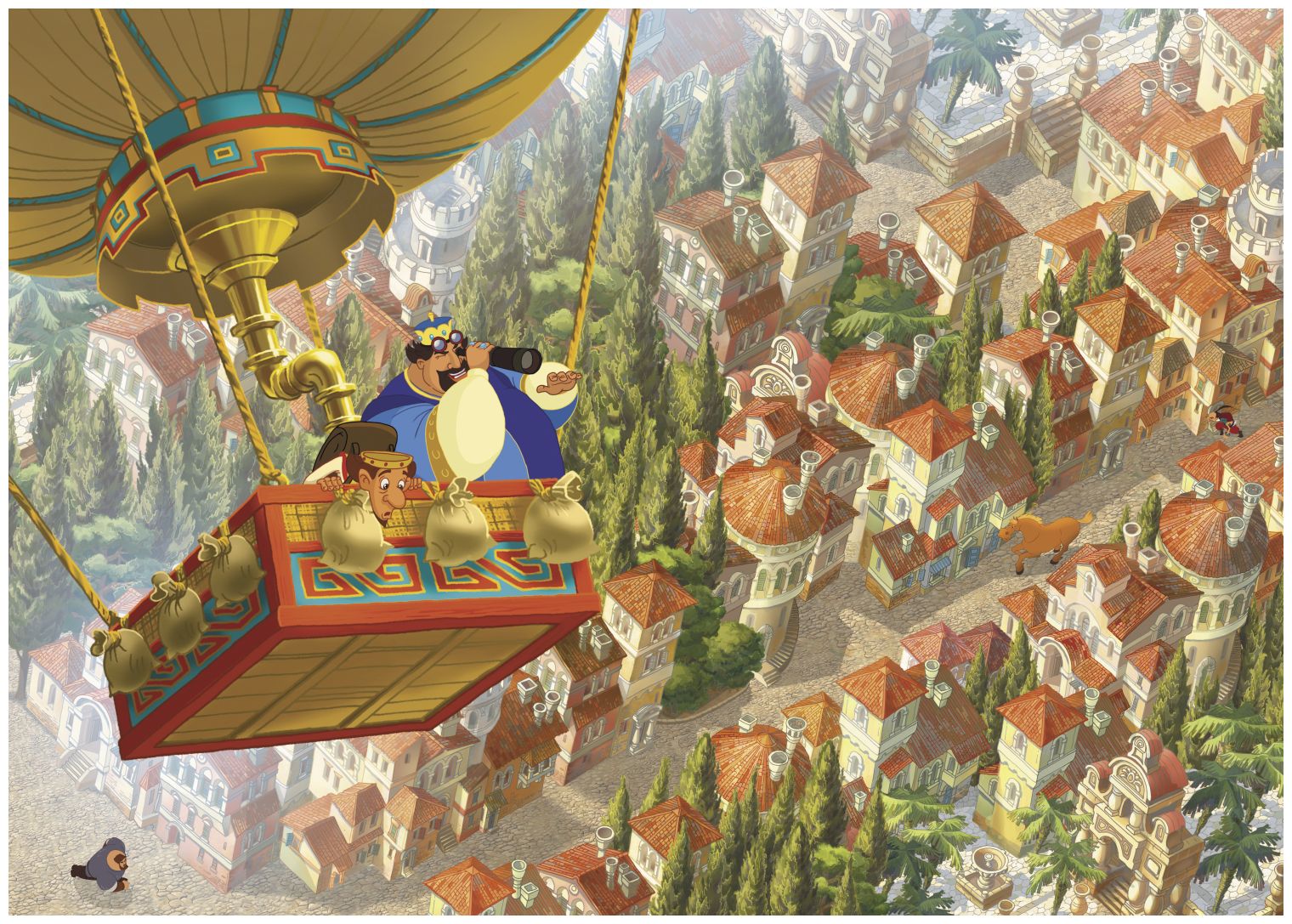 На этом воздушном шаре над городом летел Василевс вместе с несколькими своими приближёнными и в подзорную трубу рассматривал улицы города.
