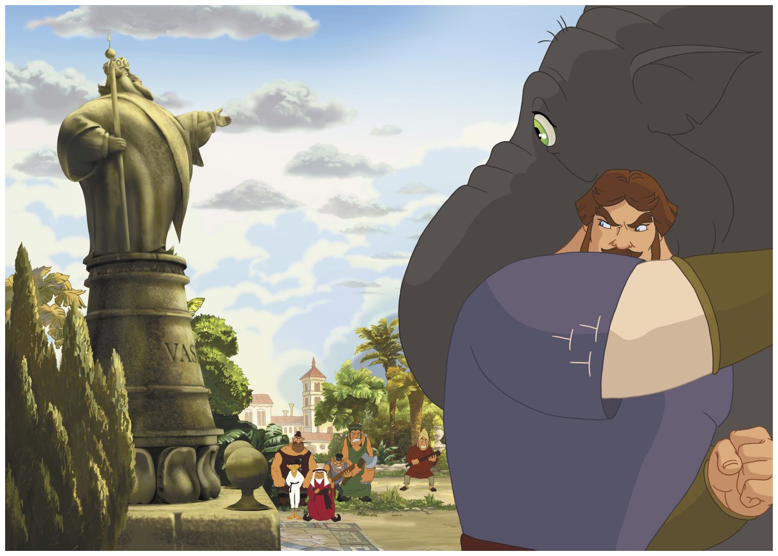 Илья с князем обернулись на крик и увидели погонщика, но в этот раз он был не один. Рядом с ним стояло несколько вооружённых людей и даже настоящий заморский каратист с чёрным поясом. Теперь не только князь, но и слон спрятался за спиной у Ильи Муромца.