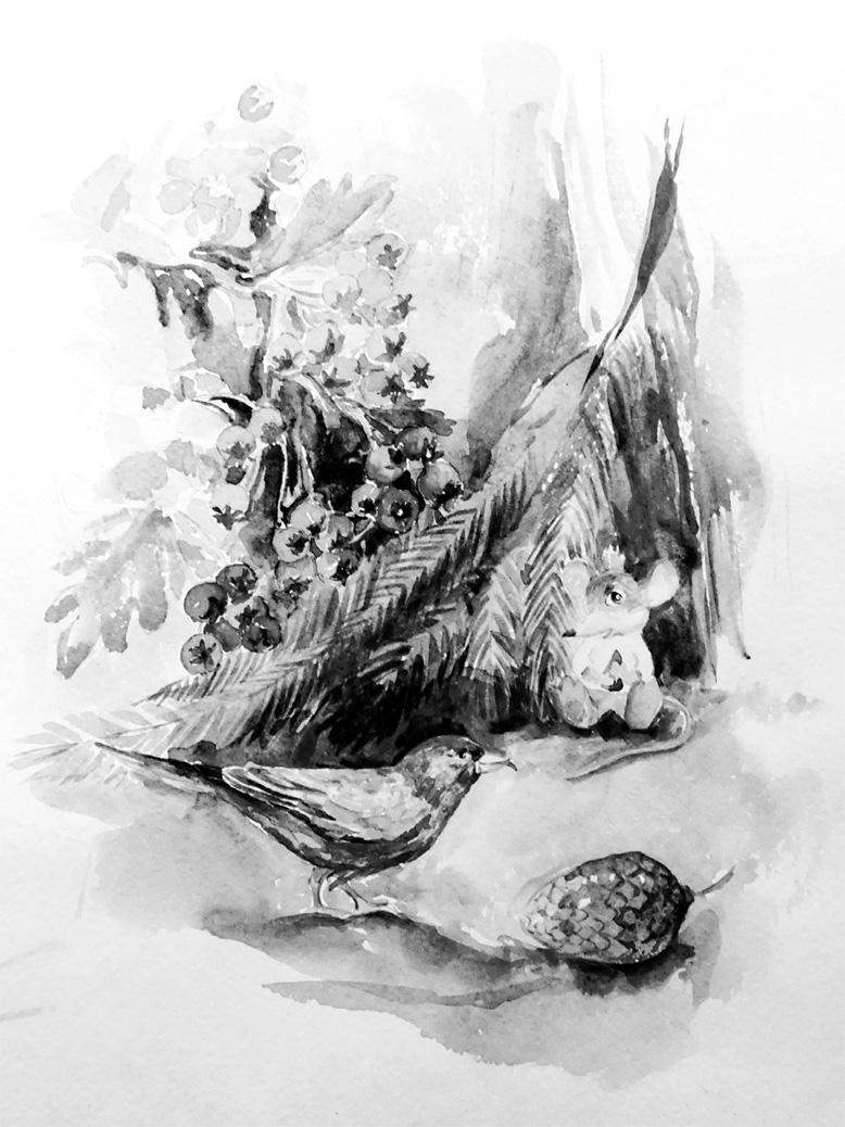 Небольшая чёрная птица легко спорхнула с куста и опустилась на землю рядом с тем местом, где притаился мышонок. Она была размером немного больше воробья, с острым жёлтым клювом и коричневыми лапками. Передвигалась прыжками, приседая при этом. Это был большой чёрный дрозд. Мик его сразу узнал по рассказам отца, который говорил, что эта птица питается насекомыми и червячками, но главным её кормом были всевозможные лесные ягоды. Поэтому он, не боясь, вышел из своего укрытия и поздоровался: