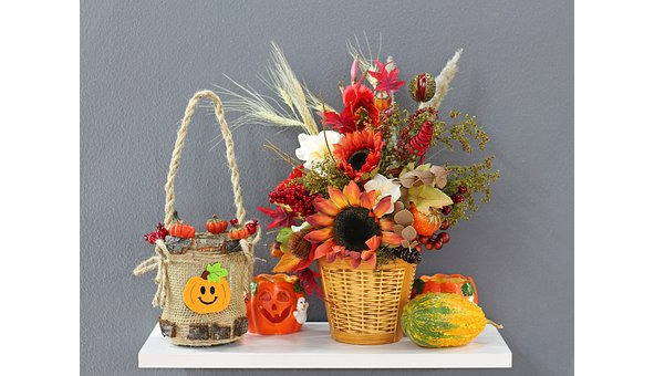Из белых нитей и нескольких сухих веточек сделаем паутинки, закрепим на них паучков – ещё одно украшение готово. Букетики из паутины можно дополнить осенними листьями и цветами, из длинных тыкв выбрать мякоть, вырезать глаза и рот, вставить в них букеты и напольные вазы готовы.