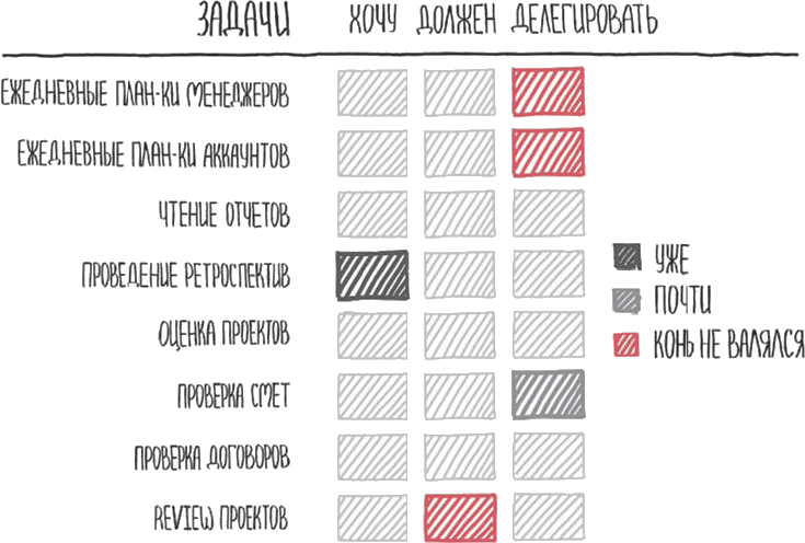 Я завел себе регулярную привычку – раз в полгода просматриваю список дел, которыми занимаюсь. Смотрю, сколько времени они у меня отнимают. Оцениваю, насколько они мне нравятся и насколько они стали рутинными. Смотрю, должен ли я их делать сам. Можно ли делегировать что-то из рутины, неприятных мне дел или тех задач, где лучше справится специалист. Планирую: когда, кому и что я могу делегировать и в каком виде.