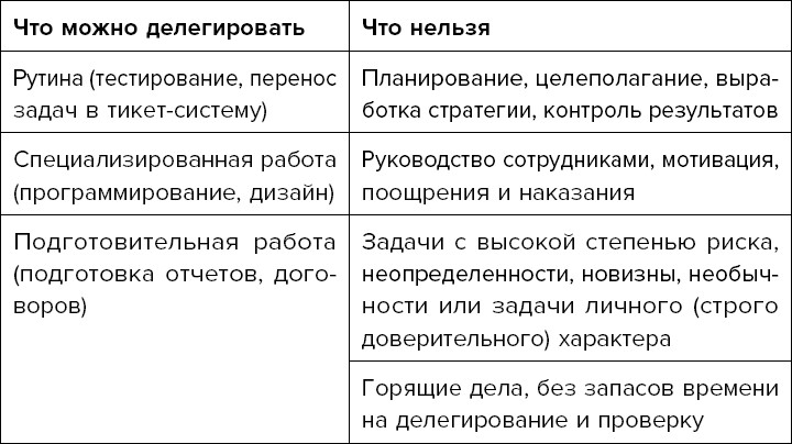 Делегирование невозможно без грамотного планирования. Банально, у вас не останется времени ни на постановку задач в нужной форме, ни на контроль. О планировании времени мы поговорим в главе 8.