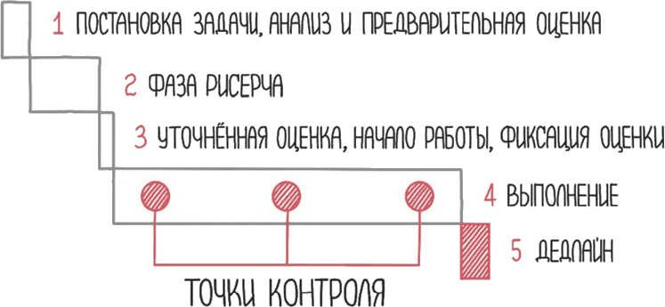 4) Выполнение задания. Согласованные контрольные точкиДальнейшие изменения оценки возможны только как форс-мажор или как косяк. И как только появился какой-то затык, нужно немедленно о нем сообщить. В длительных и сложных задачах также согласовываются контрольные точки.