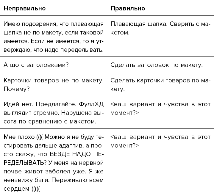 Еще одна дичь – эмоциональность (или даже скрытая пассивная агрессия) в постановках, чатах или рабочих артефактах. Ниже – пара примеров из практики: правильно-неправильно и пара примеров на «подумать», как могло бы быть правильно, а главное – чтобы поставить себя на место того человека, который получил задачу или обратную связь о своей работе в таком виде: