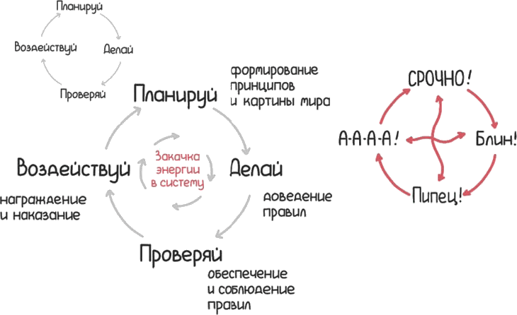Цикл Деминга «планируй-делай-проверяй-воздействуй» (PDCA, Plan-Do-Check-Act) – классическая диаграмма с точки зрения организации грамотной работы, о который мы уже упоминали в главе 1. Но если дополнить цикл с точки зрения функций власти, получится следующее: