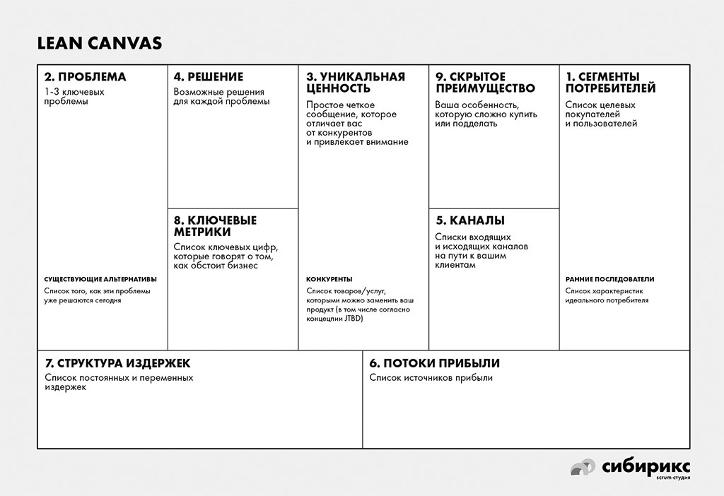 Lean Canvas – это популярный шаблон для фиксации целей продукта. В его основе – шаблон бизнес-плана Александра Остервальдера, оптимизированный под стартапы. Главный плюс – всю концепцию проекта можно разложить на один лист А4. И конечно, эта бизнес-модель вдохновлена методологией Lean Startup (читайте книгу Эрика Риса) и пропитана философией бережливого мышления.