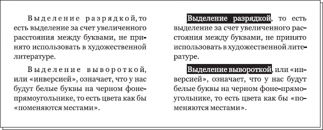 Выделение вывороткой, или инверсией (см. рис. 2.2), означает, что будут белые буквы на черном фоне-прямоугольнике, то есть цвета поменяются местами. Такое выделение используется очень редко, потому что сильно бросается в глаза и выглядит не слишком привлекательно. Тем не менее иногда его применяют при верстке журналов (обычно используют белый текст на цветном фоне, чтобы визуально смягчить эффект).