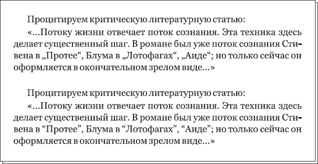Выделение кеглем, обычно более мелким, применяется при цитировании больших фрагментов текста. В этом случае цитируемый фрагмент оформляется как один или несколько отдельных абзацев, которые набираются шрифтом мень шего кегля. Часто одновременно с этим производят выделение втяжкой: увеличи вают отступы слева и справа от текста, подчеркивая тем самым, что данный фрагмент, строго говоря, не является частью текста (см. рис. 2.4).
