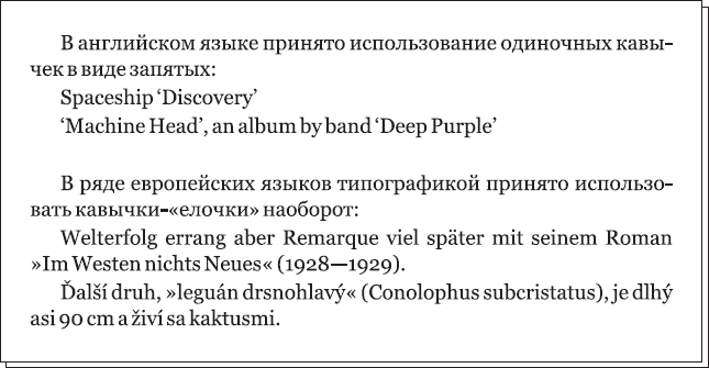 В других языках существуют другие правила расстановки кавычек. Некоторые из них показаны на рис. 2.9. Разумеется, в русском языке они не используются.