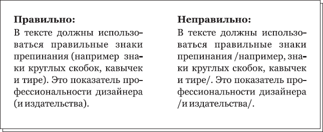 В некоторых пишущих машинках советского производства не было знаков круглых скобок, и вместо них ставили два знака наклонной черты. До сих пор можно встретить тексты, где эти символы исполняют роль круглых скобок в тексте. Такое использование является грубейшей ошибкой, и дизайнер обязан исправить эти символы в тексте на правильные (рис. 2.11).