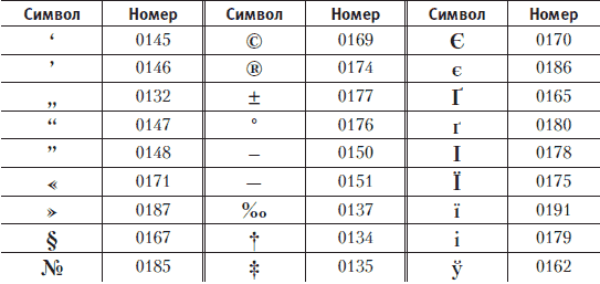 Номера наиболее часто используемых символов, а также букв украинского и белорусского алфавитов приведены в табл. 2.2. Их даже не нужно заучивать: после нескольких недель использования они запомнятся сами собой.
