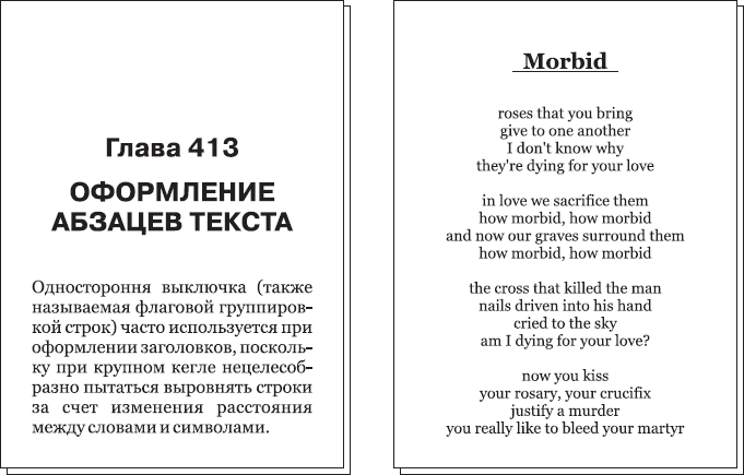 В некоторых изданиях можно встретить стихи, отформатированные выключкой по центру (рис. 2.17, справа). Строго говоря, это неправильно; традиционный способ оформления стихов заключается в выключке по левой стороне и расположении стихотворения по центру страницы за счет втяжек с двух сторон абзаца. Однако в силу эффектного и необычного внешнего вида стихотворений с выключкой по центру многие авторы предпочитают видеть свои произведения оформленными именно таким образом (впрочем, многие поэты также не пользуются знаками препинания и заглавными буквами).