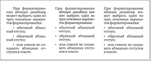 Создавать ли абзацный отступ и какого размера его создавать – остается на усмотрение дизайнера. Можно лишь сказать, что абзац оформляется тремя основными способами: обычным абзацным отступом (рис. 2.20, слева), обратным абзацным отступом (рис. 2.20, в центре) или же без отступа вообще (рис. 2.20, справа). На примере, показанном на рис. 2.20, абзацы для наглядности дополнительно отделяются отбивками.