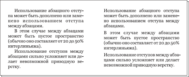 Отступы между абзацами – это увеличенное межстрочное расстояние между последней строкой одного абзаца и первой строкой следующего абзаца. Таким образом тоже можно добиться того, чтобы абзацы были хорошо видны в тексте. Строго говоря, в этом случае абзацы различаются лучше, но ввод такого отступа сильно усложняет или даже полностью исключает возможность создания приводной верстки, о которой будет говориться в следующем разделе. Сравните использование абзацных отступов (рис. 2.21, слева) и отступов между абзацами (рис. 2.21, справа).