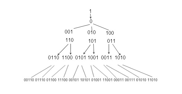 Новый Творец, то есть бывшее Творение, слившееся с предыдущим Творцом и уменьшившее притяжение, было выражено нами на предыдущем шагу как 110, 101, 011. А поскольку Творец отдает самого себя, то и переносить дальше он будет какое-то из этих своих значений, и варианты соединения с новым 0 опишутся уже шестью возможными комбинациями: