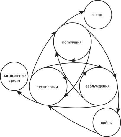 Три проблемы связаны и определяют друг друга. Растёт популяция людей на Земле. Как следствие, развивается дефицит средств существования (голод). Надо что-то делать, а это возбуждает умы мыслителей и прочих «мыслящих». Так рождаются всевозможные концепции, теории, мифы, которые, будучи неверно истолкованы, порождают системные ошибки восприятия реальности. Сами по себе заблуждения, неисправленные в «диалоге культур» и переговорах, ведут к войнам, а также развращают ум человека, вселяют в него ложный оптимизм, веру в то, что «всё можно уладить», что можно «победить природу», создать «сверхчеловека» и сотни других иллюзий ума. Эти иллюзии воплощаются в технологии, материализуются в машины, которые производят всё, что нужно для жизни всё большего и большего количества людей. Технологии загрязняют среду, истощают почву, истощают ресурсы Земли, но обеспечивают выживание даже слабых людей, неспособных жить самостоятельно, без технологий. Рост населения продолжается за счёт слабых и дефектных людей и т. д. Петля затягивается.