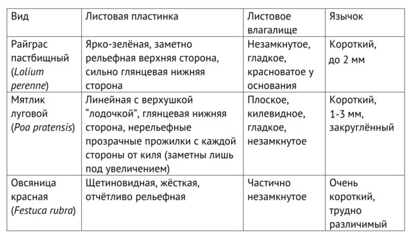 Для удобства определения видов газонных трав их основные отличительные характеристики надземных органов представлены в табл. 1.
