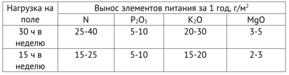 Табл. 2 – Потребность газонных трав в элементах минерального питания при различной нагрузке, г/м2 в год