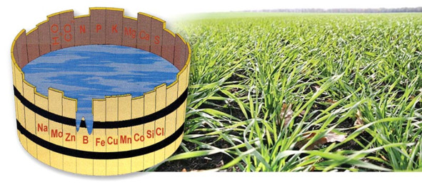 Очень важно определить потребность газонных трав не только в основных элементах питания, но и в микроэлементах (магний Mg, железо Fe, бор B, медь Cu, марганец Mn, молибден Mo, цинк Zn), играющих огромное значение в их жизнедеятельности. Нехватку одного элемента или фактора нельзя компенсировать избытком другого. Наглядно этот закон представляет собой так называемую «бочку Либиха» (рис. 6).