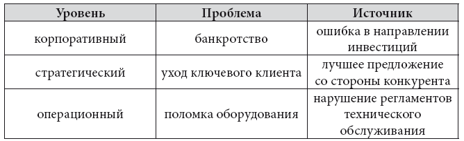 Вначале проблемы (и соответствующие решения) структурируются по уровням менеджмента: корпоративный, стратегический, тактический, операционный. Распределение проблем по уровням позволяет закрепить задачи разработки соответствующих решений за конкретными руководителями.