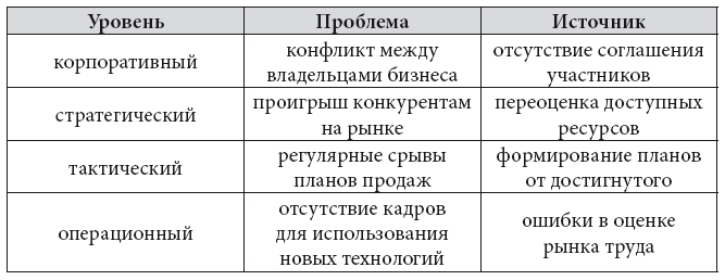 Выявление проблем данных уровней требует предвидения, глубокого анализа будущей ситуации. Причем анализ проблем должен проходить в двух срезах: обнаружить проблемы, которые уже реально присутствуют, но еще не выявлены, или в текущей ситуации им не придается должного внимания. К примеру, принимается решение о выходе на новые рынки без учета недостаточной силы бренда и слабости маркетинга в целом.