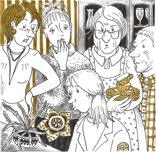 Все время принюхиваясь, я двигалась по кухне под напряженные взгляды окружающих и – о ужас! – наконец поняла, откуда исходит этот кошмарный запах… На окне сиял огромный, сантиметров десять в диаметре, великолепный бархатный желто-пурпурно-черный цветок и также «великолепно» вонял! Этот красавец испускал отвратительный запах падали…